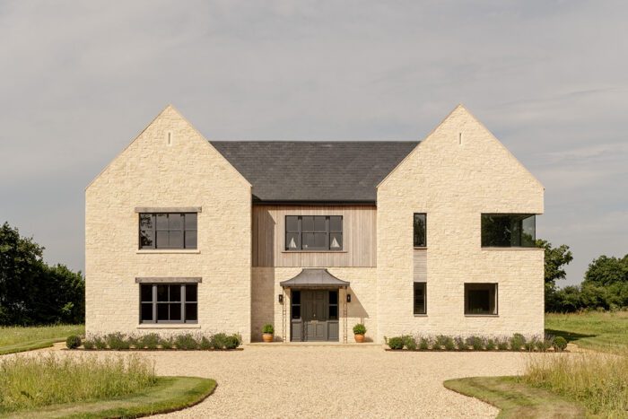 An iron and lead-roofed entrance porch leads to a structure built from locally sourced Marnhull stone and timber cladding, allowing the property to sit naturally within its surroundings.