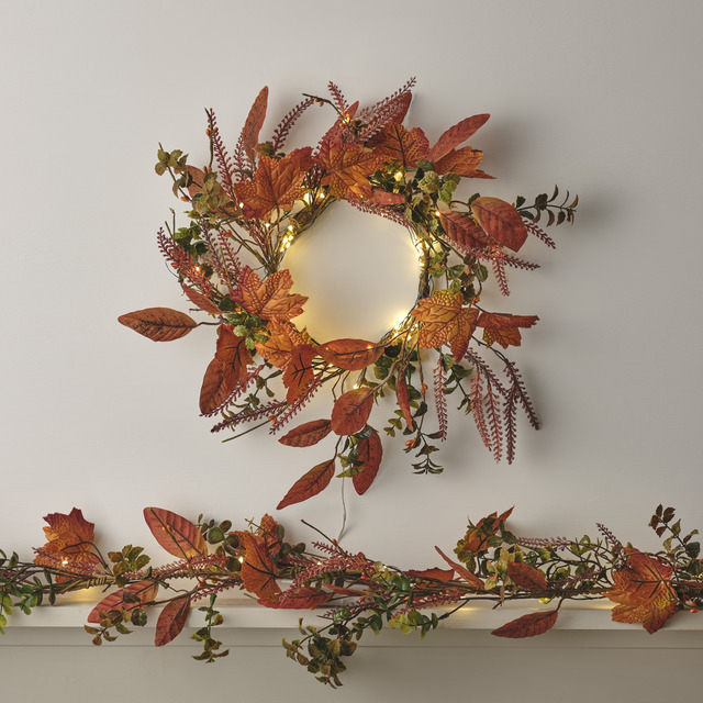 - 40cm Pre Lit Maple Lead Autumn Wreath, £39.99 from Lights4fun – buy here