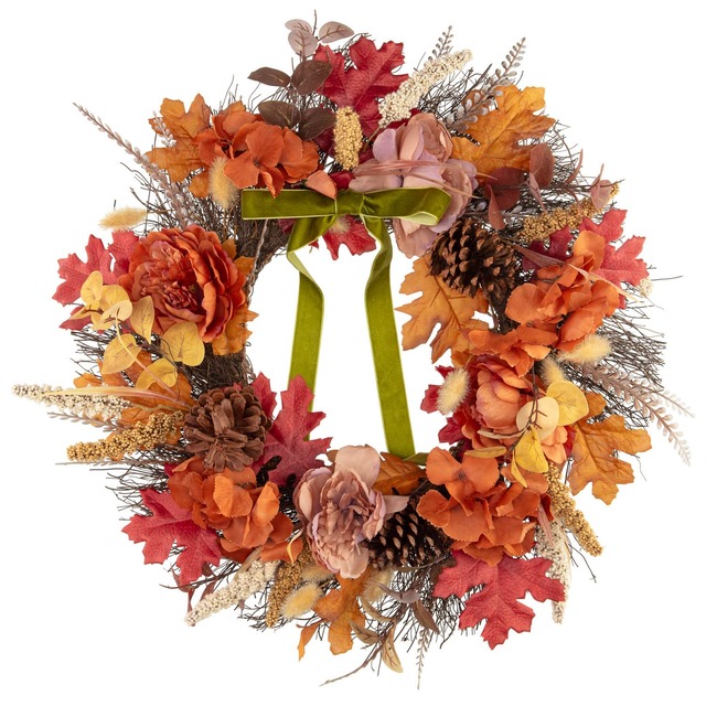 1. Pinecone & Flowers Harvest Wreath with Bow