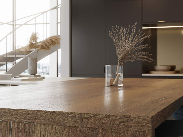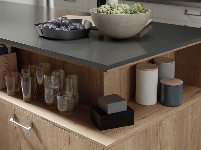 For Japandi design, a Truffle or Midnight Pietra kitchen worktop hides imperfections yet looks even better with age.