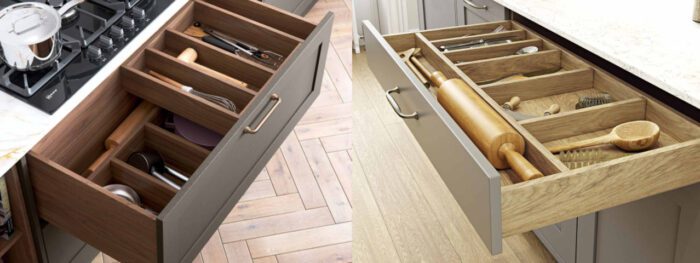 Filling their built-in, wooden cutlery trays with rustic items is a great way to embrace the wabi-sabi interior style.